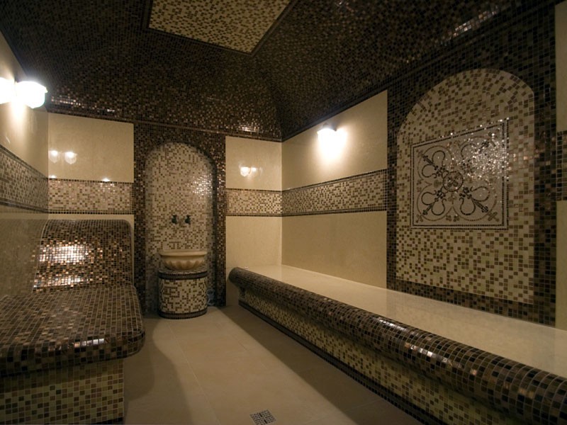 Материалами для внутренней отделки турецкой бани могут выступать: натуральный камень, керамическая плитка или мозаика. В качестве украшения могут создаваться разнообразные архитектурные формы, ниши и панно в восточном стиле. Учитывая старые традиции, создается оригинальный и изысканный дизайн.